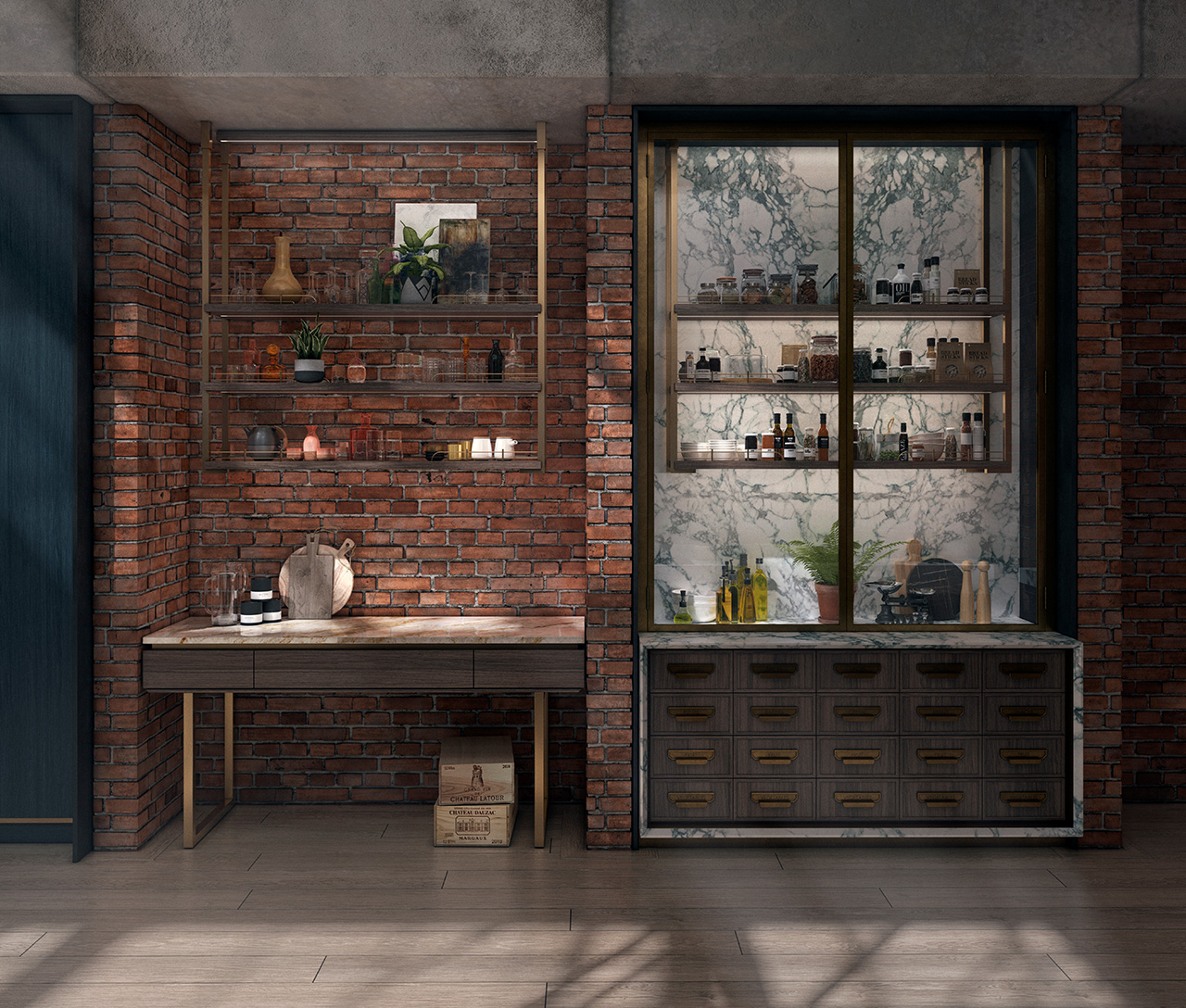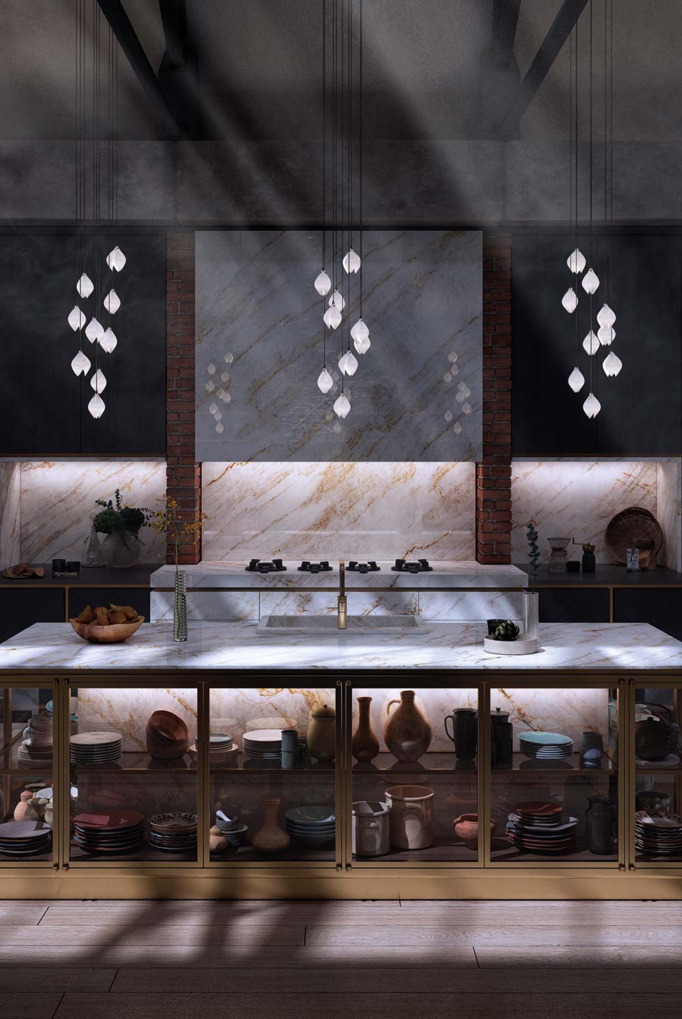 Our concept for luxury kitchen design in a new age. Inspired by its own canvas, it finds its home in this repurposed industrial space, dating back to the 1800s. Our design celebrates the innate character of the historical architecture and in doing so, seeks to redefine the meaning of luxury for a sustainably-minded contemporary family.